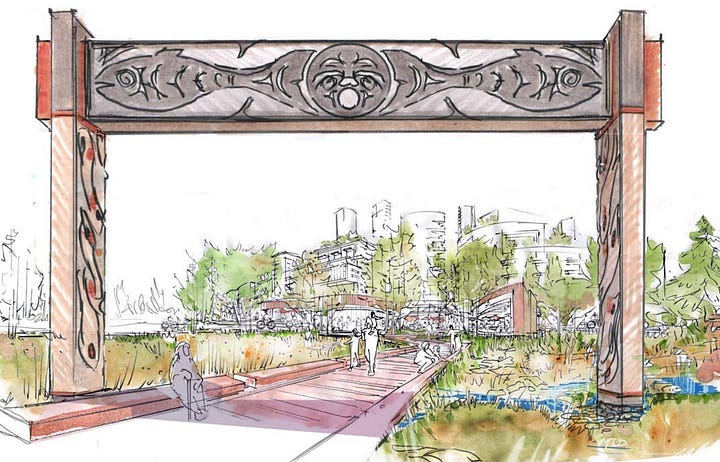 Community spaces in the parks, gathering spaces, and commercial spaces will include visual representations of Musqueam, Squamish, and Tsleil-Waututh cultures and create spaces for cultural events and activities to take place.